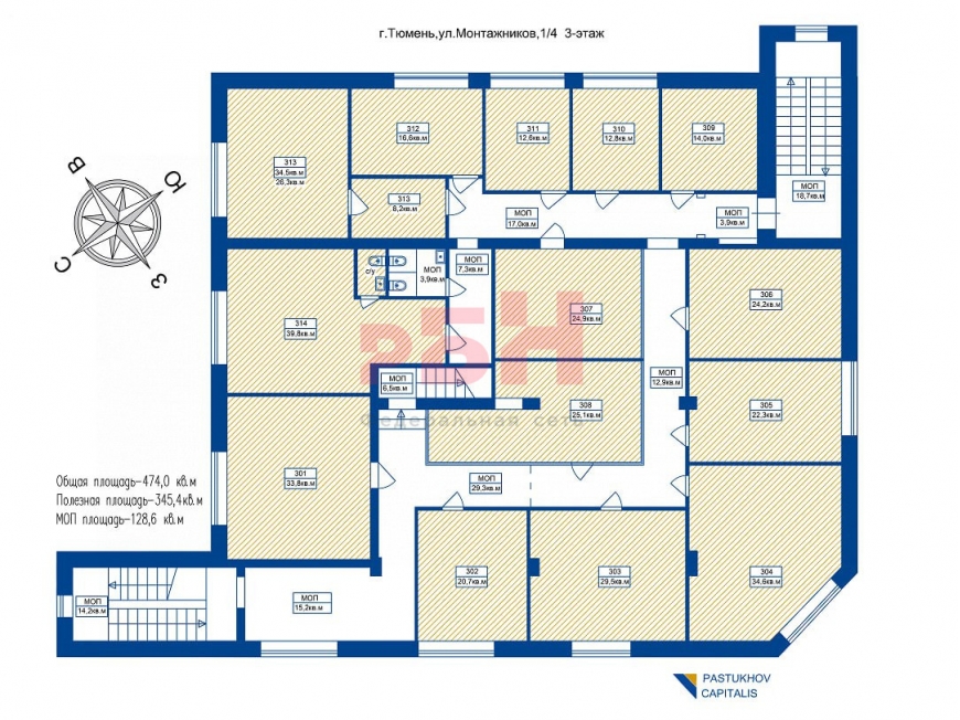 Имеются офисы различной площади на 2-м и 3-м этаже.